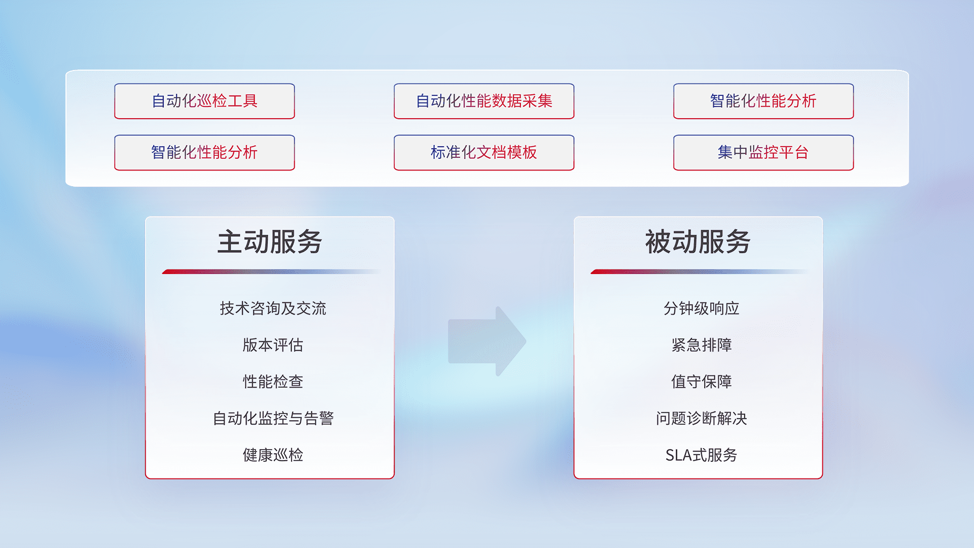智能化工具和标准化文档,,保障服务质量,,,,提供主动服务(包含技术咨询、、、版本评估、、、性能检查、、、、自动化监控与告警、、、、健康巡检)和被动服务包含(分钟级响应、、紧急排障、、值守保障、、、、问题诊断解决、、、、SLA服务)。。
